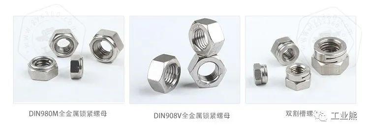鎖緊螺母分為全金屬系列鎖緊螺母或者非金屬嵌件系列鎖緊螺母等。全金屬系列鎖緊螺母,一般會(huì)利用螺母變形防松的型式,一般通過割槽的型式,或者擠壓螺紋變形的型式,例如法標(biāo)的雙割槽螺母,以及DIN980V鎖緊螺母,或者采用螺母頂部加裝金屬簧片的型式,起到鎖緊的作用,例如DIN980M鎖緊螺母。